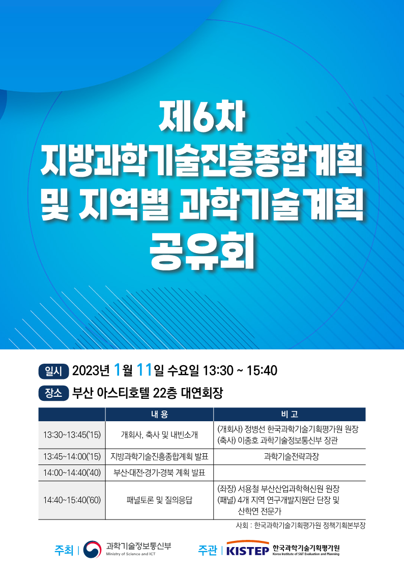 - [일반공지] [한국과학기술기획평가원] 제6차 지방과학기술진흥종합계획 및 지역별 과학기술계획 공유회 참석 안내
